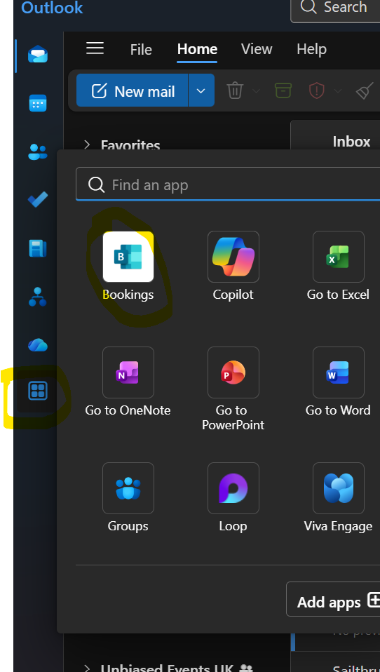 1. In Outlook, search for “Bookings” in the navigation bar and click on the associated app.